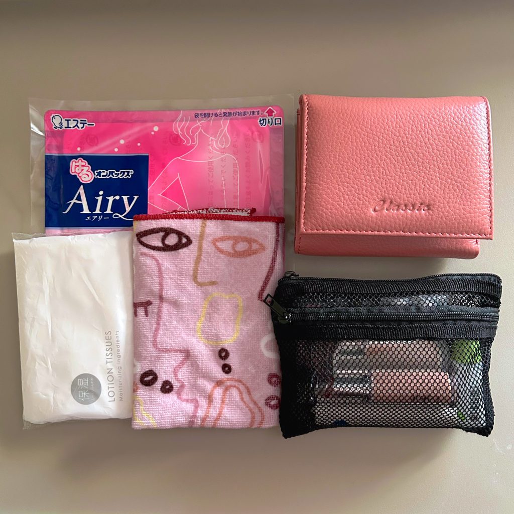 ポーチの中身はリップ、手鏡、目薬、薬。ダイソーで見つけたファスナー二つある使い勝手の良いミニポーチ。今回は早めに会場に行く予定なので念の為カイロを持参。これにスマホとのど飴、マスクそしてチケットも持っていきます。除菌シートは今回必要なさそうなので必要になったら現地で買おうと思います。