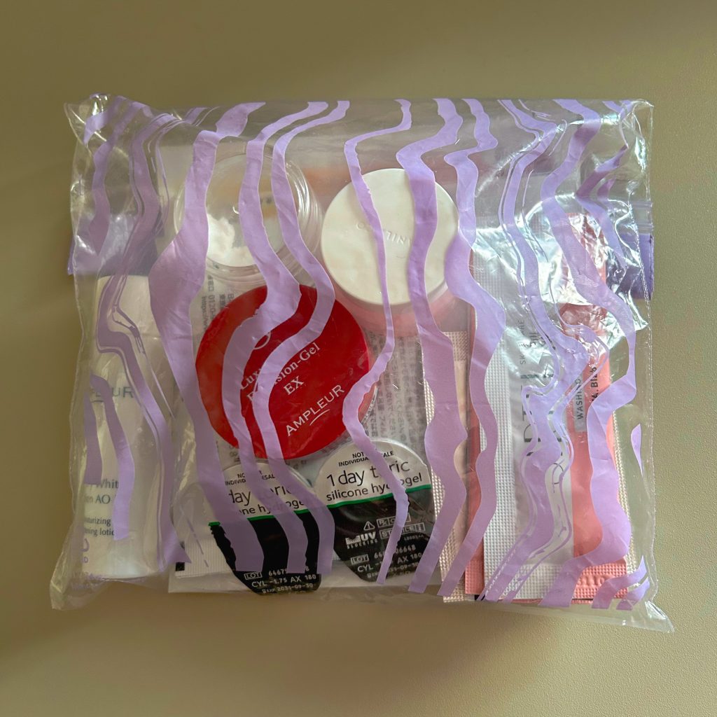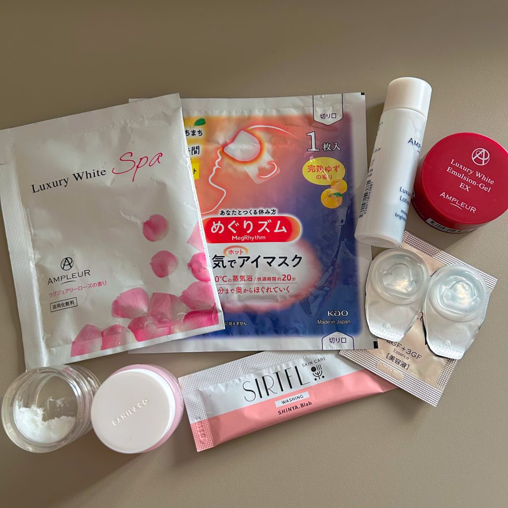 めぐリズム、洗顔、ヘアバーム、コンタクト以外は頂いたものや、試供品、おまけなどです。ボディアンドヘアバームは最近お気に入りで使用しているジョンマスターオーガニックの物を無印のケースに移し替えました。このバーム髪の毛の静電気も抑えられ、程よくストンとなりベタベタしないし香りも癒されるのでめちゃくちゃお気に入りです。ボディに使えるので使用後はそのまま手に馴染ませます。旅行にもピッタリ。