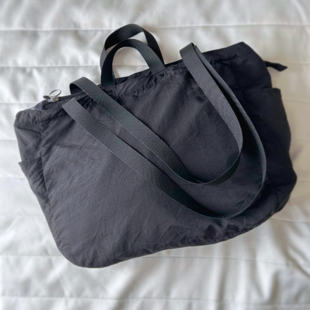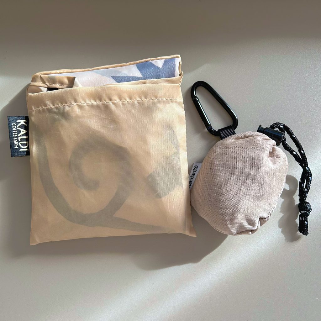 カルディのエコバッグは食品を入れる用。ホテルに行った際に飲み物などちょっとしたものをいつも購入する為。カルディのおまけです。右の折りたたみのエコバッグは広げるとショート丈のアウターが入る万能サイズ。これはライブ会場でアウターをしまう時に使用する為。